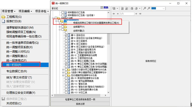 答:(1)項目工程中,點(diǎn)擊“項目管理”下拉選擇“統(tǒng)一打印”功能,進(jìn)入報表打印界面。如下圖所示: