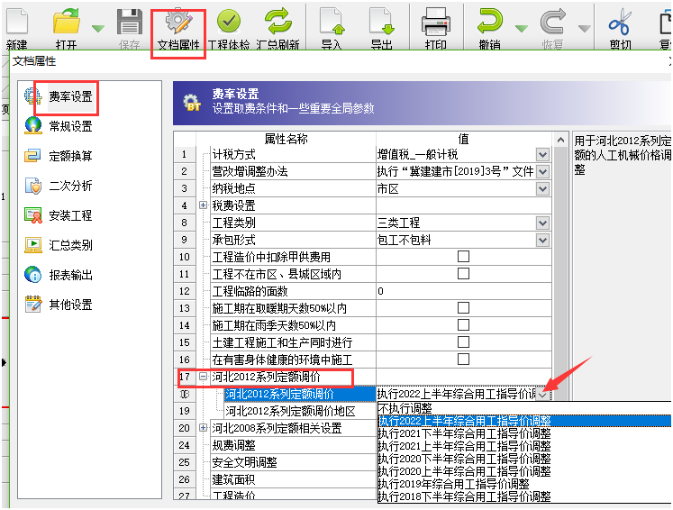 答:各地市出文件的時間不一致,大家使用的時候一定要更新到最新版本軟件程序。 更新到最新版本之后,點(diǎn)擊文檔屬性窗口,在默認(rèn)的第一個費(fèi)率設(shè)置界面可以切換選擇對應(yīng)時間對應(yīng)地市的人工指導(dǎo)價文件。如下截圖: