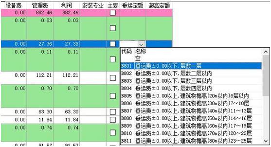 3)、執(zhí)行該命令,彈出如下窗口,應(yīng)計取的超高及垂運(yùn)費(fèi)用定額將變成紅色,其計取基數(shù)變成藍(lán)色。 4)、直接雙擊紅色定額行 或 點(diǎn)擊“單條添加”按鈕,可實現(xiàn)單條添加該項費(fèi)用定額到當(dāng)前選擇的位置。點(diǎn)擊“自動完成”按鈕,將自動添加當(dāng)前工程所有的“垂運(yùn)費(fèi)”和“超高費(fèi)”定額,點(diǎn)擊“自動完成”按鈕后,點(diǎn)擊自動完成,系統(tǒng)自動檢測工程中是否已經(jīng)存在相關(guān)費(fèi)用定額。如已經(jīng)計取了相關(guān)費(fèi)用,會進(jìn)行提示。