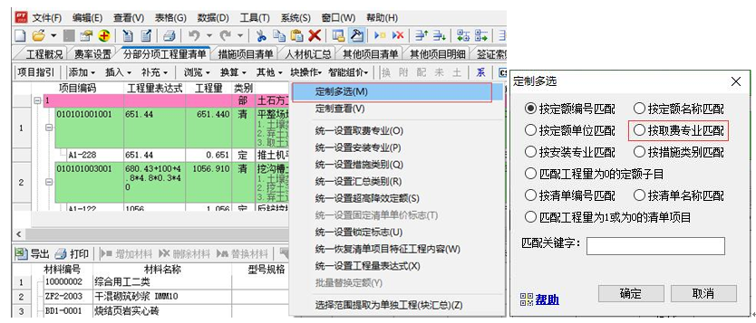 2)、選擇多條定額子目,統(tǒng)一設(shè)置“超高垂運(yùn)”標(biāo)志 (1)手動按“Ctrl+左健”可選擇多條定額子目; (2)在“分部分項工程量清單”或者“預(yù)算表”界面,點(diǎn)擊“塊操作”下拉選擇“定制多選”,按取費(fèi)專業(yè)選擇裝飾裝修專業(yè)點(diǎn)擊確定(這個選擇方法會一次把裝飾定額全部選擇中)。