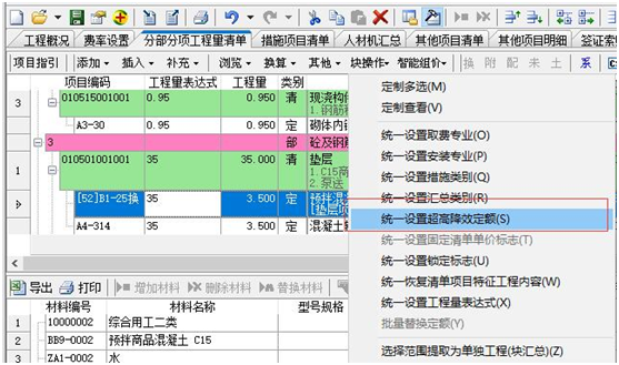 (3)通過“塊操作”下的“統(tǒng)一設(shè)置超高降效定額”功能,可對選中的定額進(jìn)行統(tǒng)一設(shè)置超高降效標(biāo)志。如下圖所示: