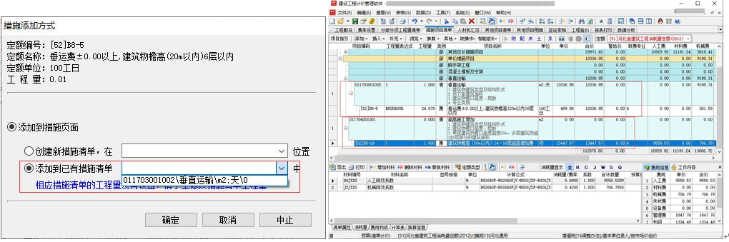 6)、點(diǎn)擊“確定”按鈕,由于當(dāng)前工程為清單工程,系統(tǒng)自動將費(fèi)用定額添加到措施頁面中對應(yīng)措施項目下,如下圖:
